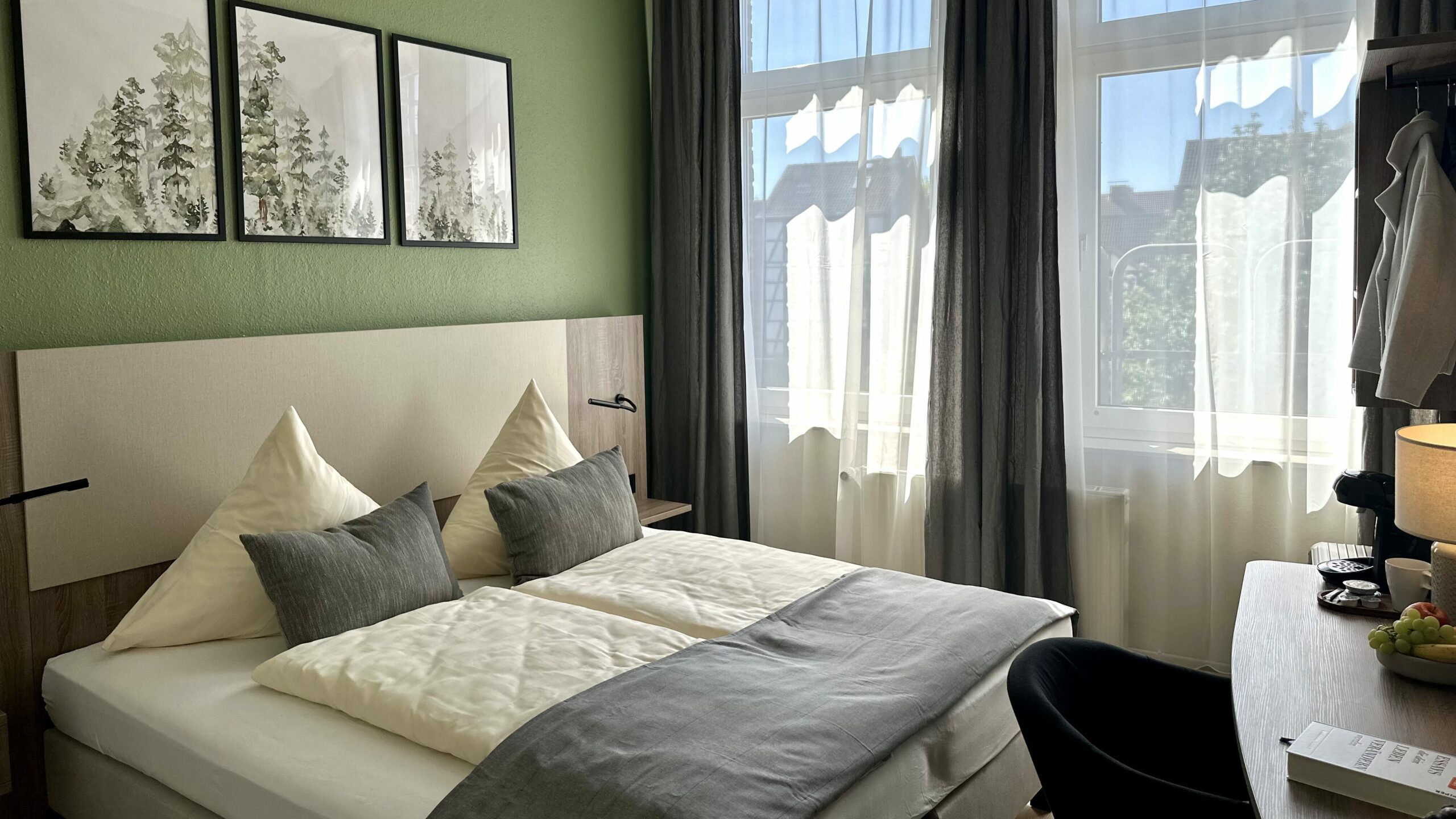 Unsere Standardzimmer sind kompakt geschnitten und verfügen über ein modernes Badezimmer mit einer nahezu bodengleichen Dusche. Zur Ausstattung gehört eine praktische Garderobenablage mit mehreren offenen Regalen für Ihre Kleidung sowie eine Kleiderstange mit Bügeln.